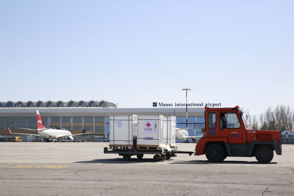 在吉爾吉斯斯坦比什凱克瑪納斯國際機場,工人轉運新冠疫苗(2021年3月19日攝)。新華社發(fā)(羅曼攝)
