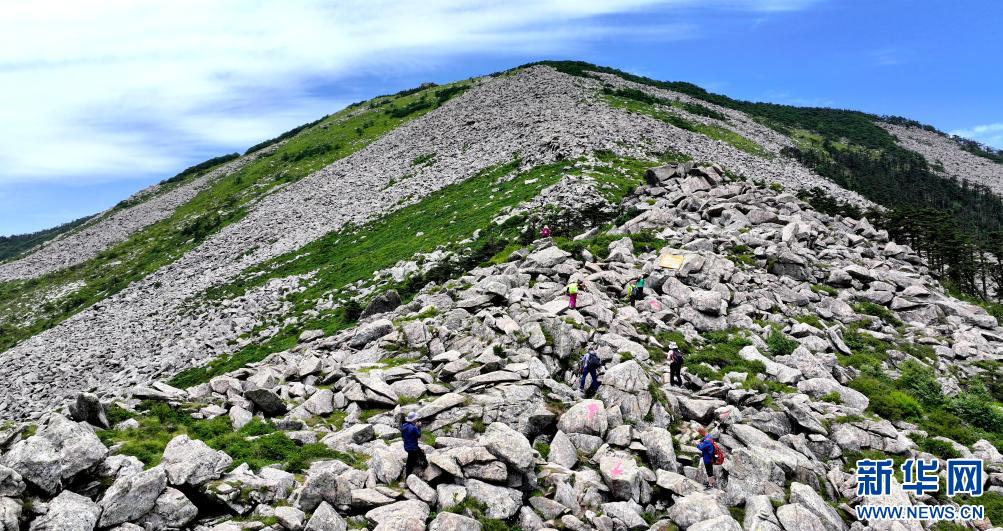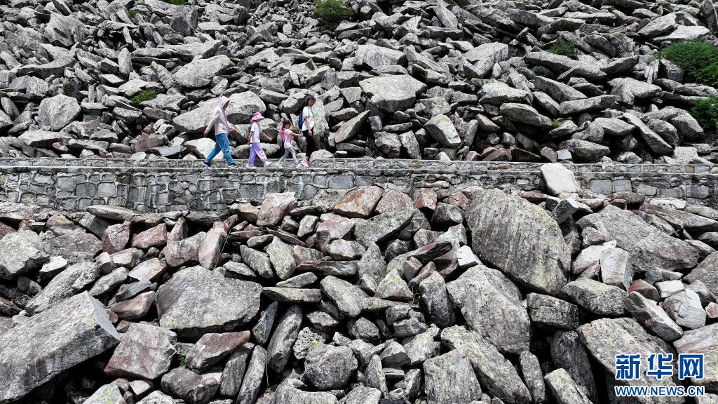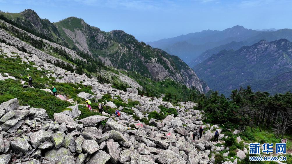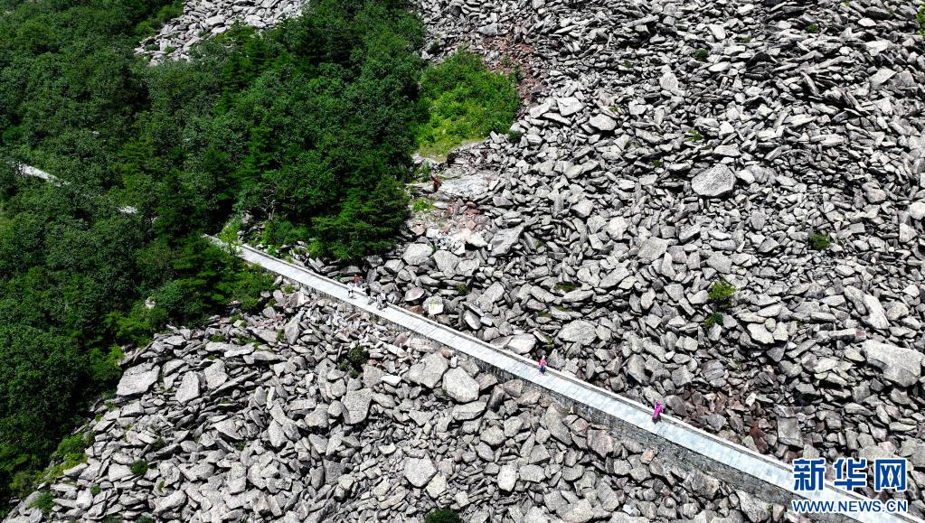 游人經(jīng)過陜西朱雀國家森林公園內的石海(7月21日攝,無人機照片)。公園內的大面積石海,是典型的冰川侵蝕地貌,也是秦嶺地區(qū)冰川遺跡的代表。