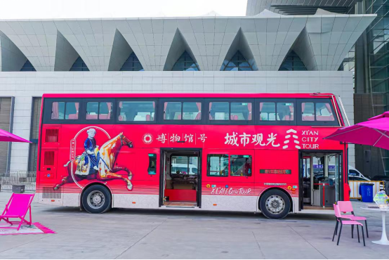 西安城市觀光汽車運(yùn)營管理有限公司展出的西安城市觀光為雙層梅紅色,裝修風(fēng)格融入了很多傳統(tǒng)文化元素,車輛內(nèi)部對(duì)參觀者開放。觀光車內(nèi)特意布置了案幾、花束,擺放了很多文創(chuàng)產(chǎn)品,天花板和小桌板上均裝飾有傳統(tǒng)紋樣圖案。