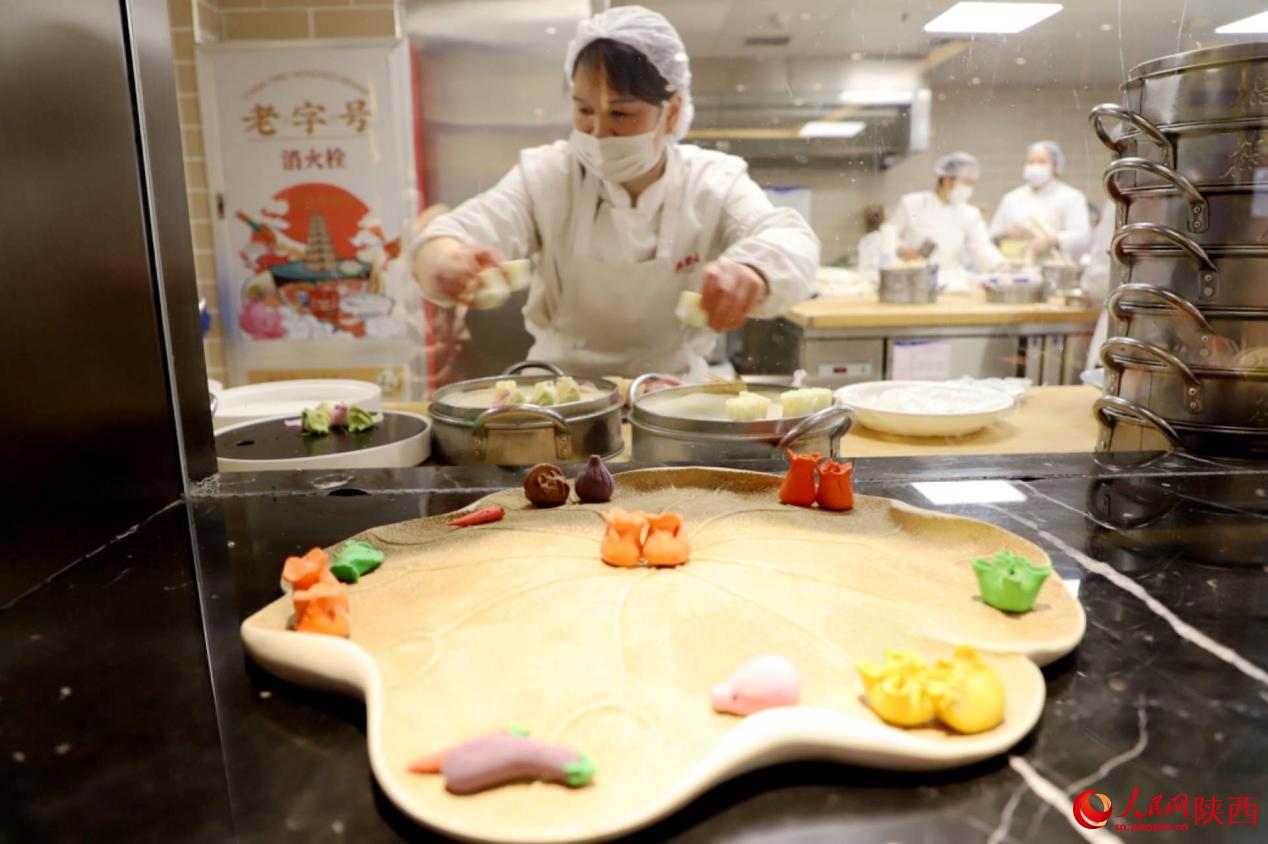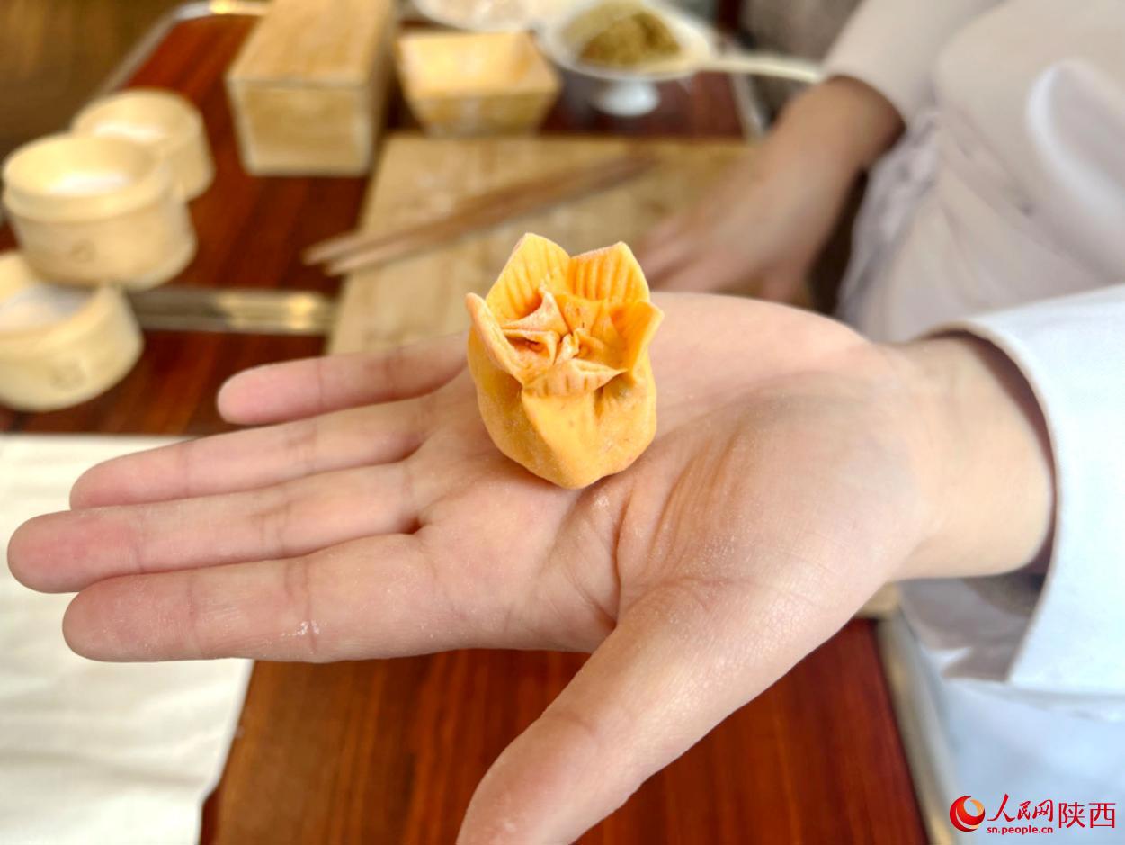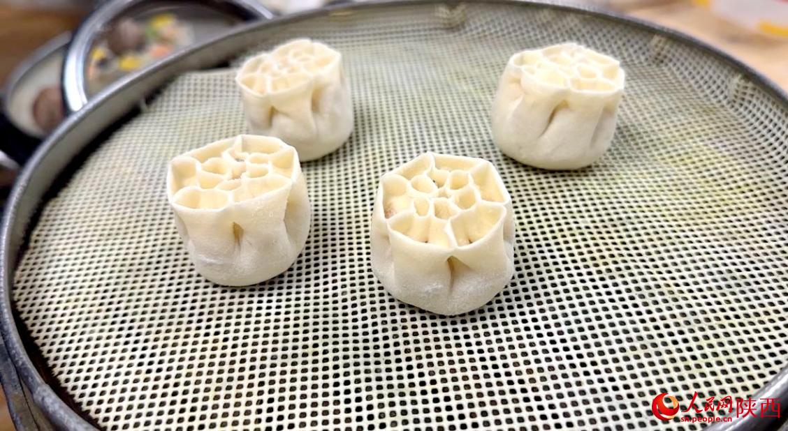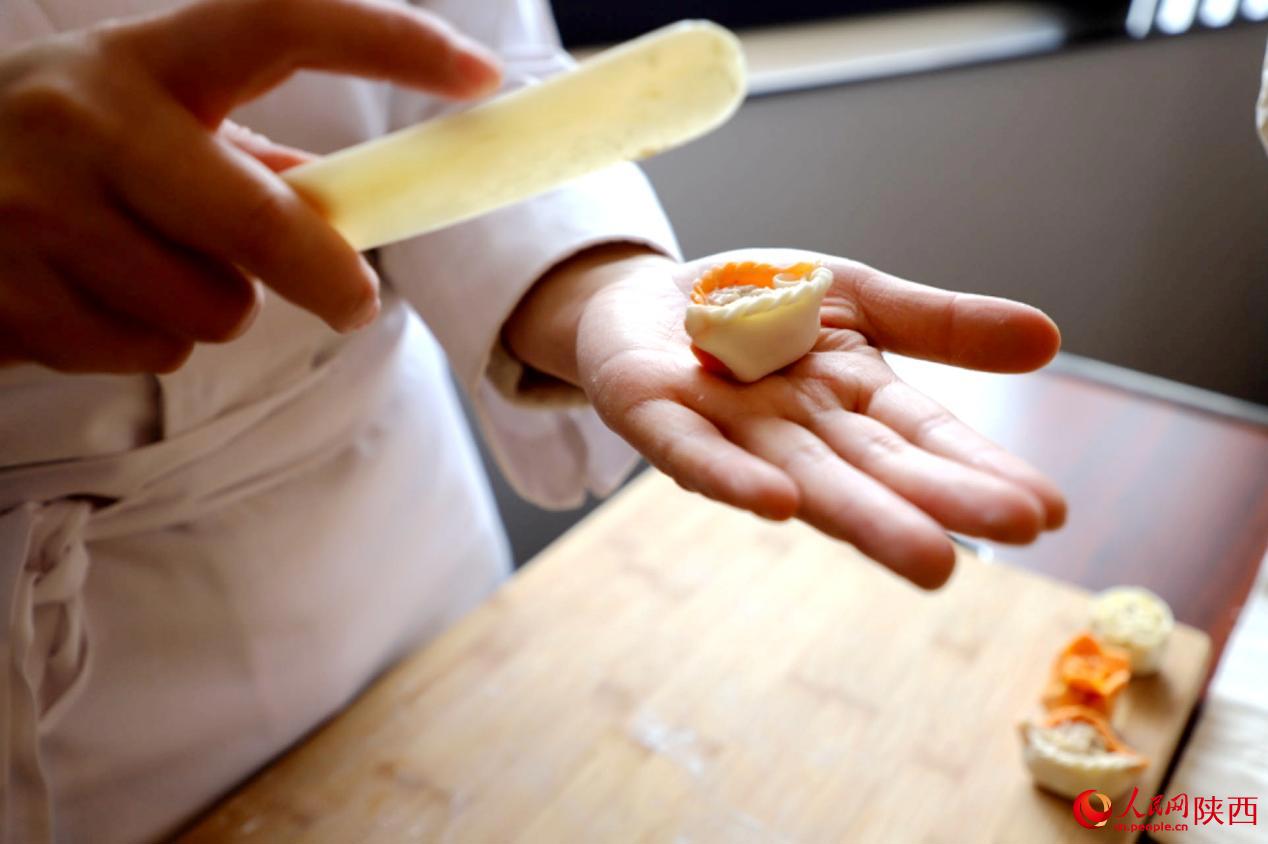 當美食與文化結(jié)合,會碰撞出怎樣的火花?高珊手上動作不停,一朵“芙蓉”、一朵“石榴花”隨著她的手指翻飛逐漸變得栩栩如生?!啊鏊饺亍厦嬗?3個孔,代表著13個王朝曾在陜西建都,而‘百花迎賓’的形狀來源于西安市的市花——石榴花,表達的是對所有來賓的熱烈歡迎?!备呱航榻B道。
