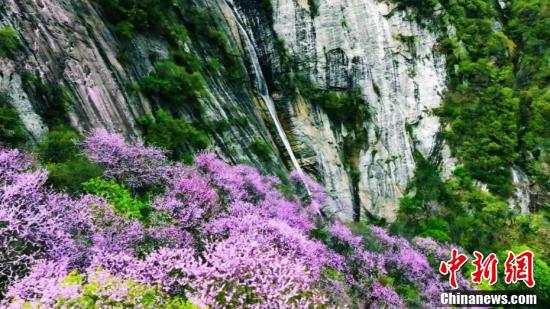 紫荊花與秦嶺山間飛瀑相映成趣。