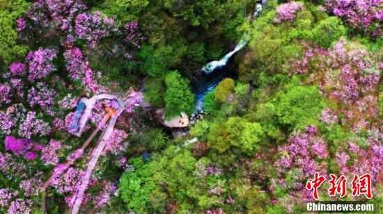 近日,隨著氣溫回升,位于秦嶺腹地的陜西太平國家森林公園內(nèi),漫山遍野的紫荊花盛開,與“彩虹飛瀑”相映成趣,吸引了不少游人前來賞花踏春。圖為俯瞰秦嶺腹地春景如畫。