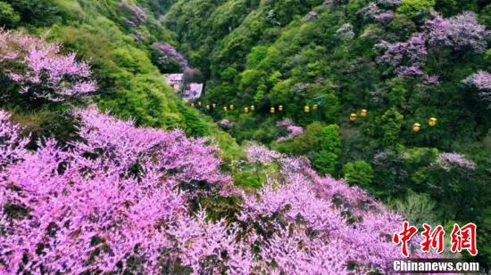 秦嶺山間春色迷人,纜車點(diǎn)綴在紫荊花海中。